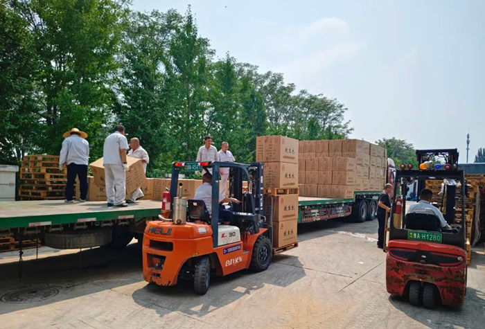 華騰化工立即調度人力、物力,爭分奪秒組織應急物資配送。歷經5個多小時不間歇備貨、裝載,滿載應急物資的4輛大貨車陸續發車,前往抗汛一線。